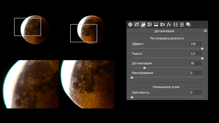 Больная тема соотношение резкости к шуму. Последнего почти не будет если занизить детализацию, увеличить радиус и не использовать шумоподавление. Края при этом на удивление выглядят лучше. Это так. Заметка...