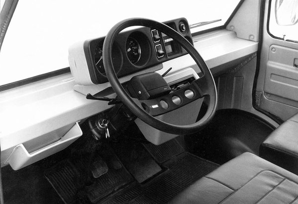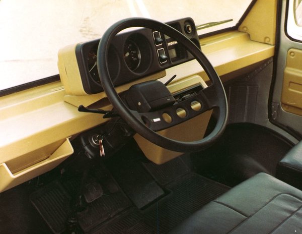 Дизайн интерьера сделал Михаил Маркиев. Пространства для художественного маневра здесь было еще меньше, чем в 2802-02, поэтому интерьер получился минималистским, но хорошо ложащимся в общую эстетическую концепцию машины. Приборы взяли от ВАЗ-2105, расположив их в очень компактном блоке. Само крепление блока приборов к панели можно было впоследствии, при подготовке к производству, сделать шарнирным, для регулировки угла наклона. Панель вдоль всего плоского лобового стекла сделана в виде плоской полки, на которую можно положить бумаги или что-нибудь некрупное. Слева от водителя — дополнительный ящик для документов. Обшивки в кабине — минимум, все основные панели — жесткие, это очень практично. А чтобы уменьшить градус унылости такого простого интерьера, переднюю панель и дверные накладки выкрасили в бежевый цвет. Формовали эту панель прямо в Дизайн-центре, из листового АБС-пластика, по деревянной оснастке.