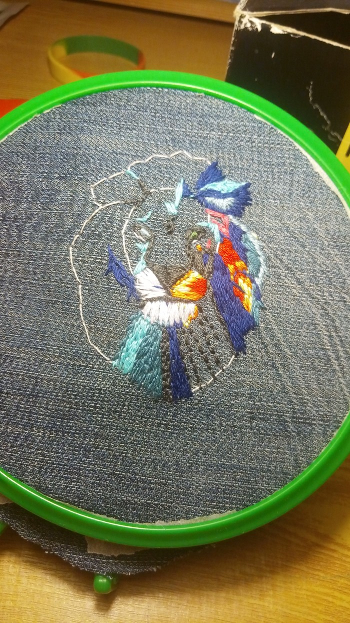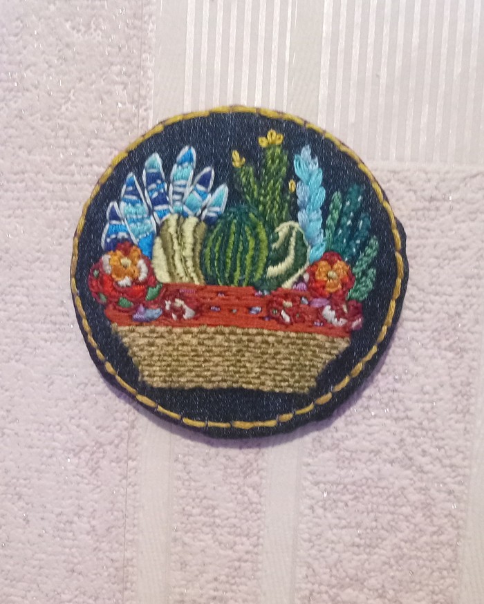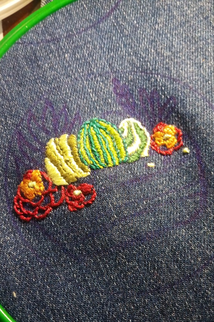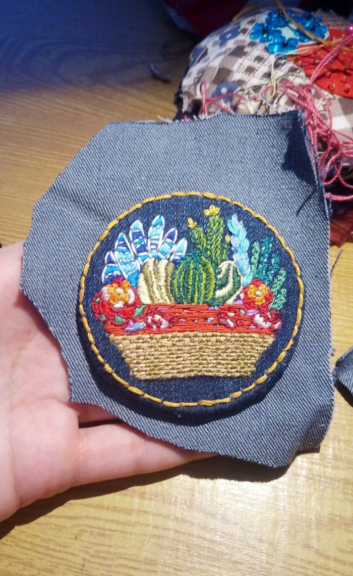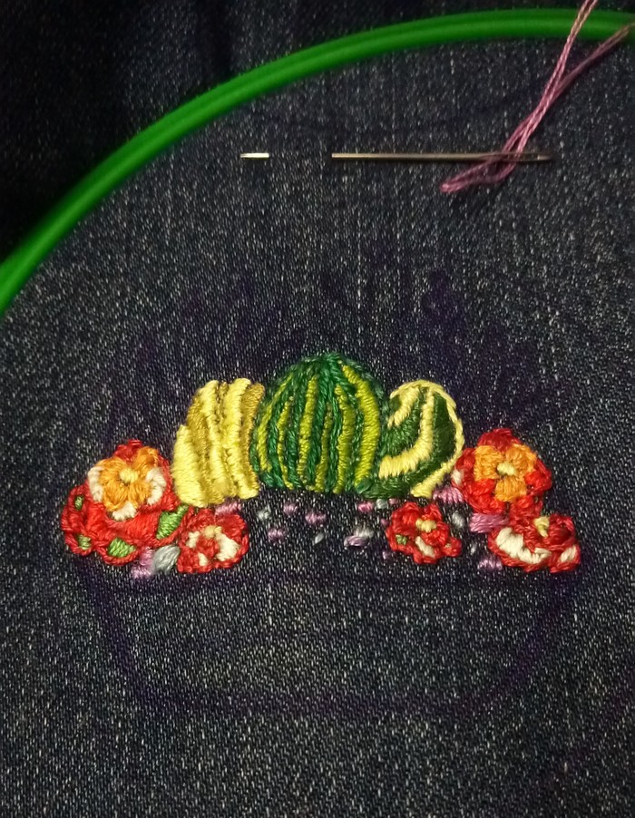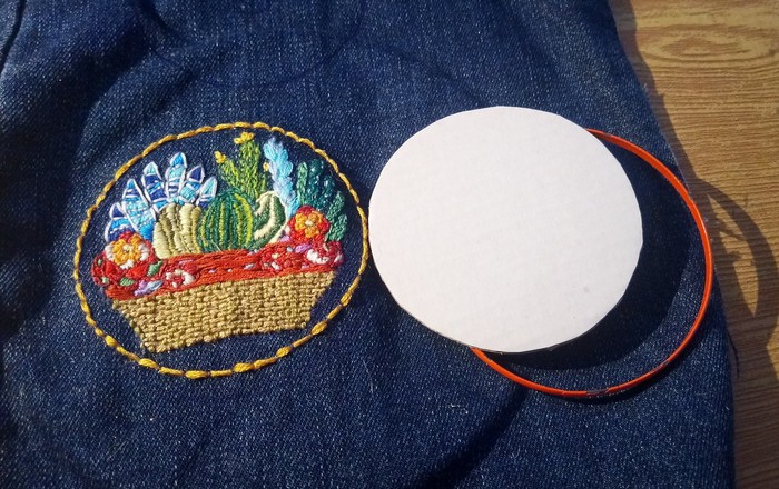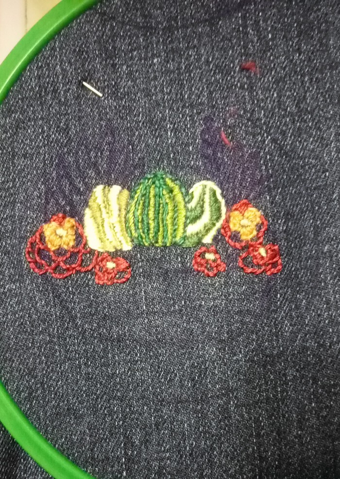 Вышивка выполнена гладью на стрейч джинсе. Нитки разные: ДМС, Кировка и другие безымянные...