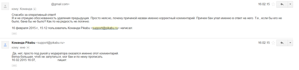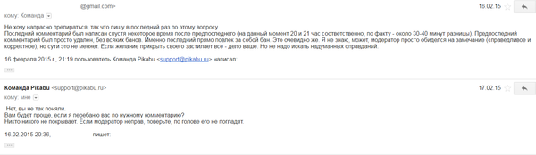 Спустя некоторое время я с удивлением увидел себя забаненым за корректный пост с критикой модератора. С пометкой "Оскорбление пользователей". Бред? Ещё какой! Уверенный, что это недоразумение, я пишу на электронку админа. После чего он, по всей видимости, пересылает сообщение саппорту, с которым у меня состоялся любопытный диалог. Вы, конечно, можете посчитать, что все нормально, но после скринов я приведу свои доводы с наглядной аналогией.