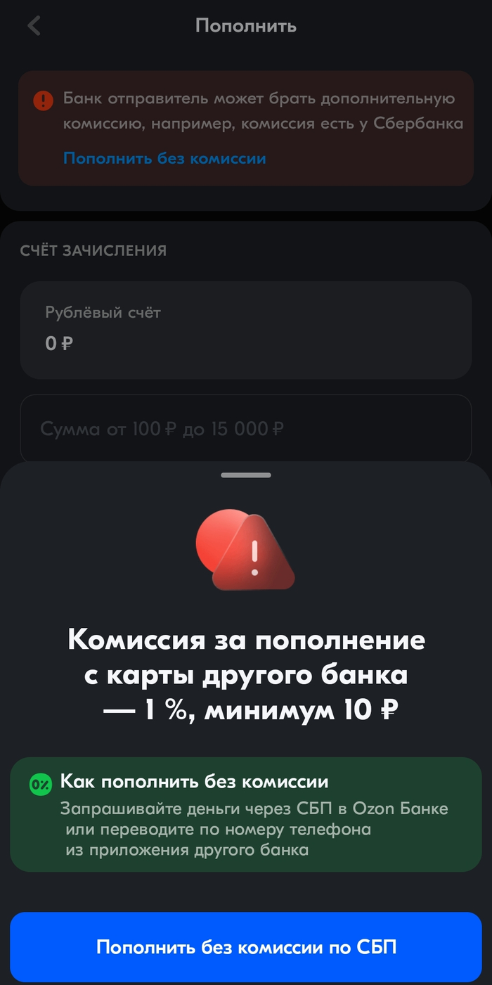 Везде и всегда озон говоря о своих картах указывал что любые пополнения идут без комиссии, если только её не берёт банк-отправитель.