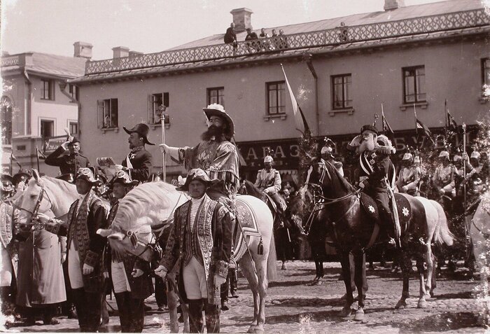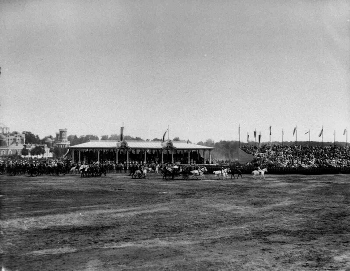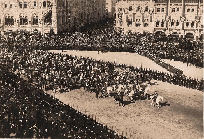 Император Николай II (на белом коне) в сопровождении свиты шествует перед трибунами от Триумфальных ворот по Тверской улице в день торжественного въезда в Москву их императорских величеств