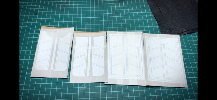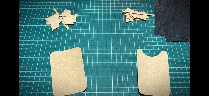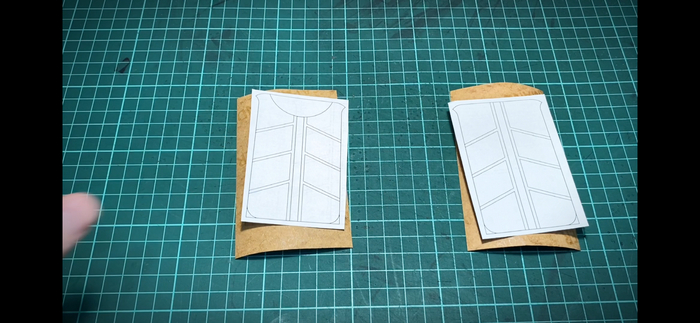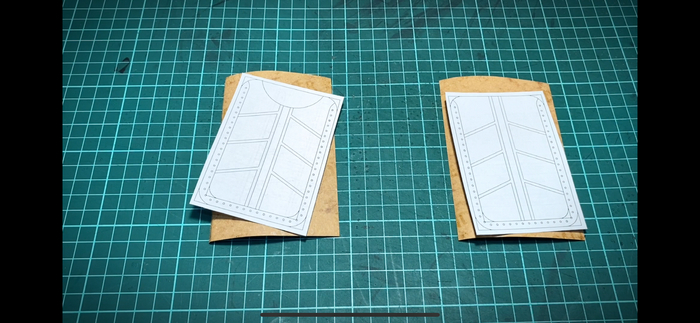 4. Приклеиваем скотчем (я использовал бумажный) выкройку к отрезкам кожкартона.