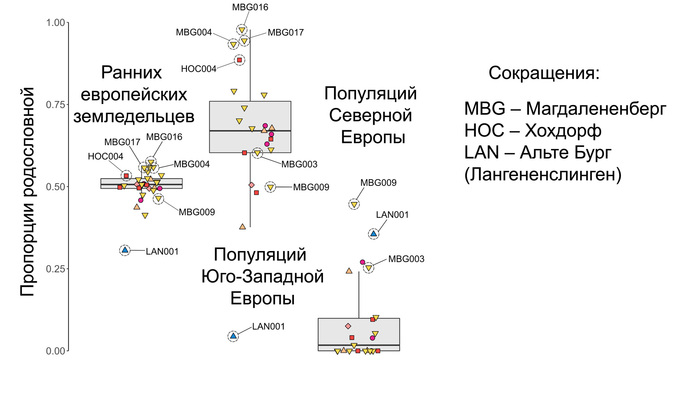 Анализ выявил глубокие различия в пространственно-временной динамике неолитизации между восточной и западной частями Европы вдоль пограничной зоны, простирающейся от Черного моря до Балтийского. К западу от этой пограничной зоны, переход к неолиту сопровождался крупномасштабными сдвигами в генетической родословной, от местных охотников-собирателей к земледельцам анатолийского происхождения (Boncuklu_10000BP). Этот переход в зависимости от региона охватывал обширный период времени, более 3 тыс. лет, от самых ранних свидетельств на Балканах около 8700 лет назад до 5900 лет назад в Дании.