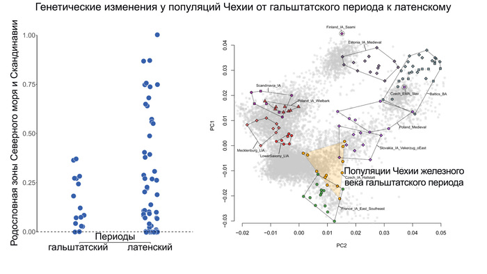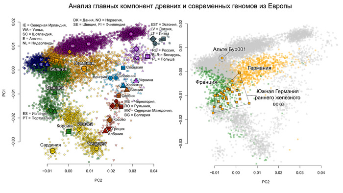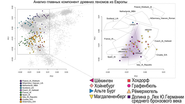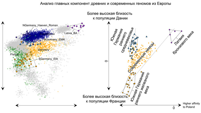 Полученный набор генетических данных позволил при анализе главных компонент использовать за основу древние геномы, и уже на них спроецировать положение современных популяций, а не наоборот, как это было во многих предыдущих исследованиях.