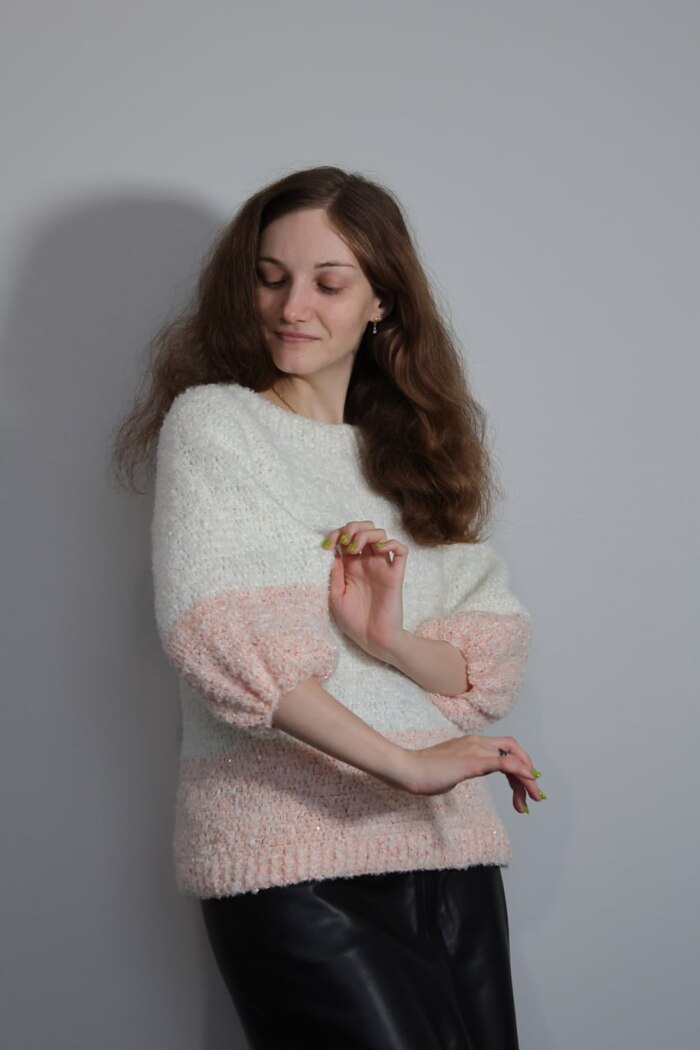 На фото видно, какой свитер рыхлый, и это не очень красиво. В процессе работы ряды растягивались как твари, при том, что начальные воздушные петли стягивались.