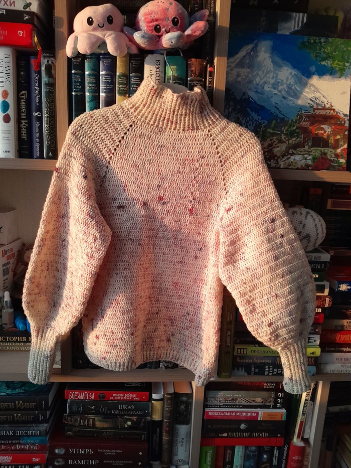 Пока вязала джемпер поняла, насколько мне неинтересно стало вязать крючком. Какой-то день сурка, одно и то же, если что-то с узором, то это либо ажур прозрачный, либо массивное полотно как доспехи. Я так думаю, что я перестала получать удовольствие от процесса именно из-за однообразия, а значит, пора брать в руки спицы. Штош, за выходные освоила платочку и лицевую гладь. Пожелайте мне терпения, чтоб я не бросила!