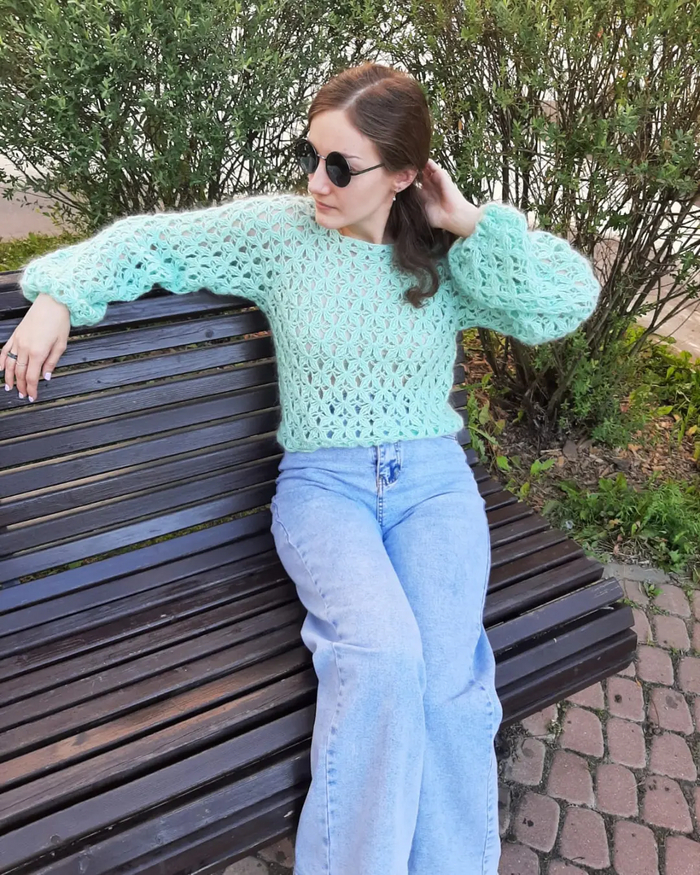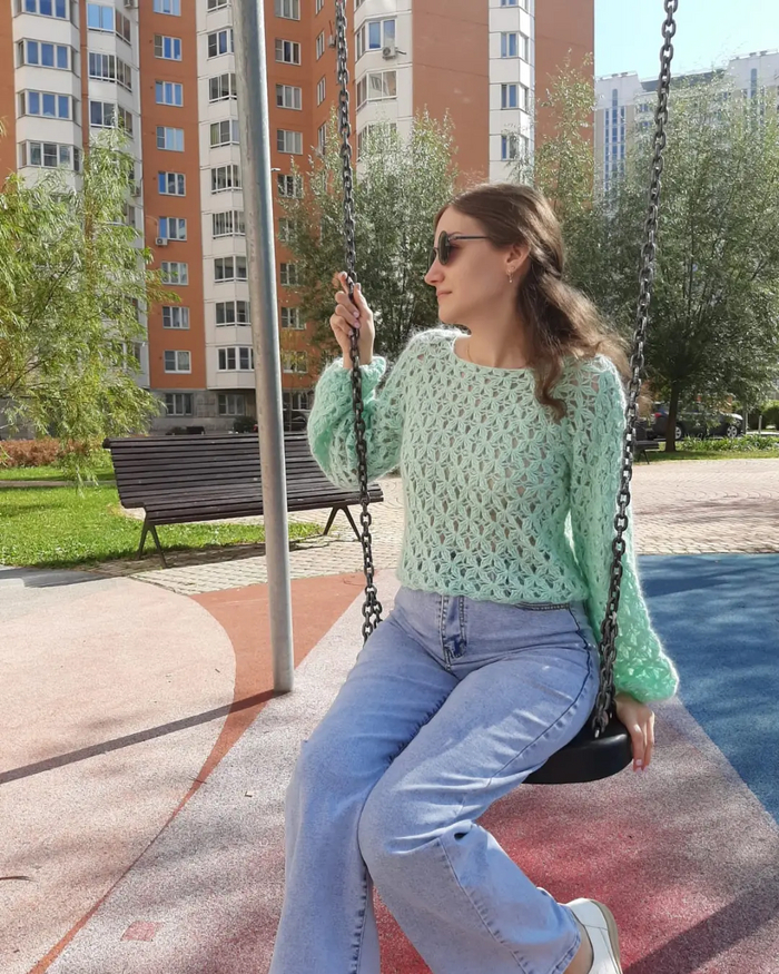 Всем пикабушникам пламенный привет! Давным-давно я сохранила себе схему одного шикарного узора, и вот время пришло - я в нем разобралась! На свет появился лёгкий пушистый свитер из мохера на хлопке от Камтекс. Взяла я третий крючок и пошла творить очередную вещь 🧐