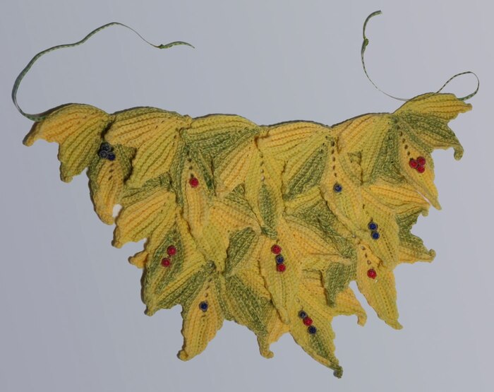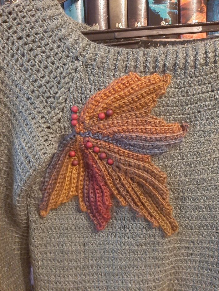 Связан крючком из пряжи ЯрнАрт Милано. Мне показалось, что он скушный, поэтому я пришила на него листочек с бусинками 😅
