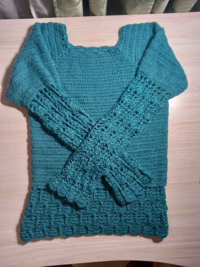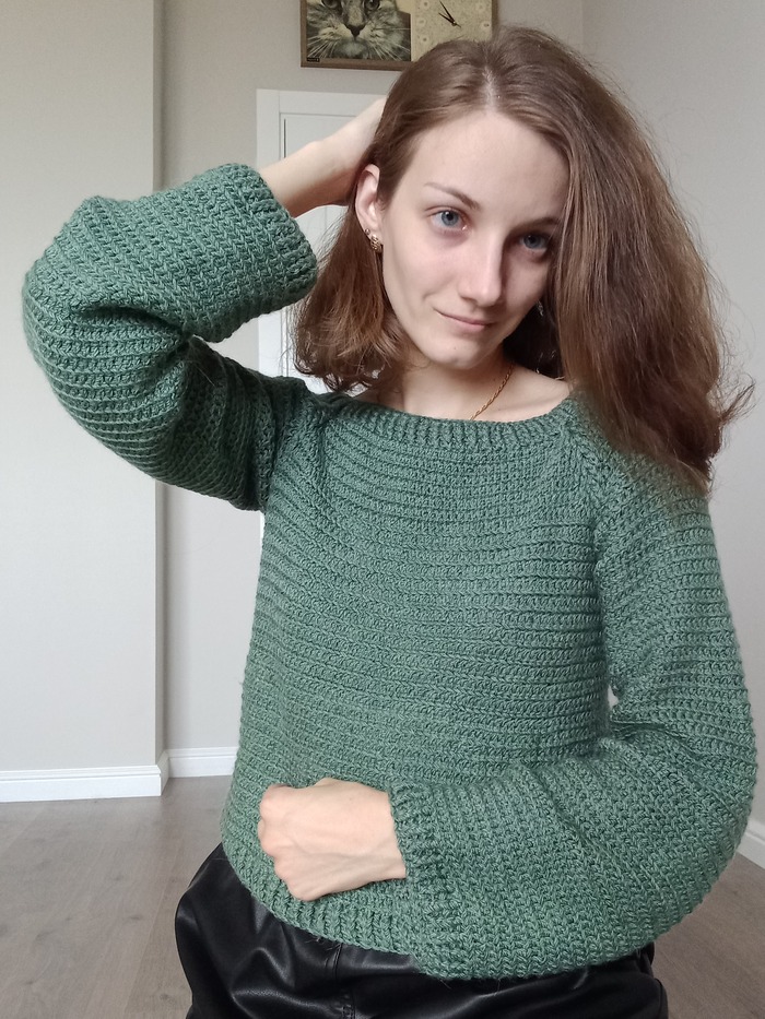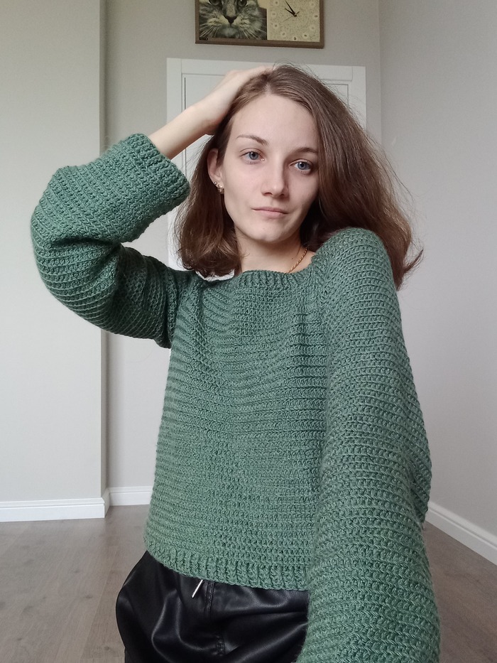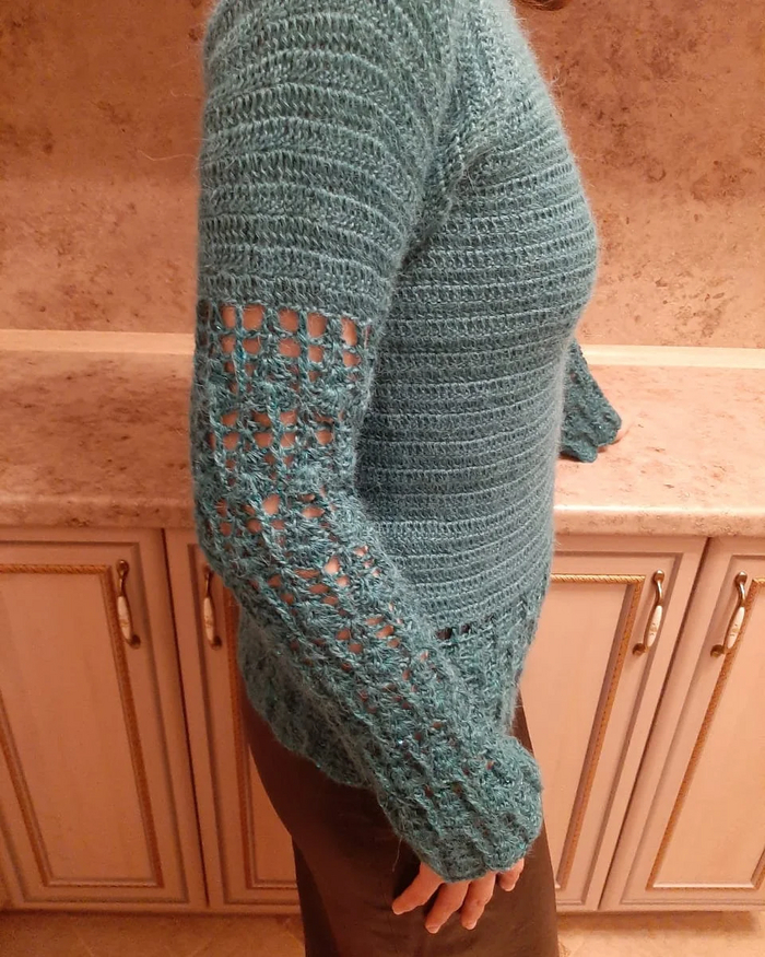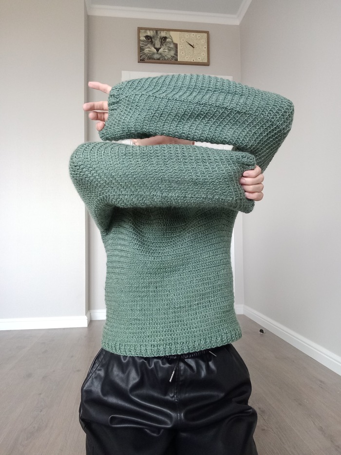 Конечно, его можно было связать ещё короче, так сказать, почти под грудь, но я за удобство, поэтому он не самый короткий из возможных. Но для меня и это большой прогресс, так как я воспринимаю только свитера до колен