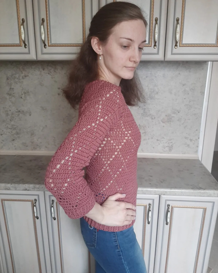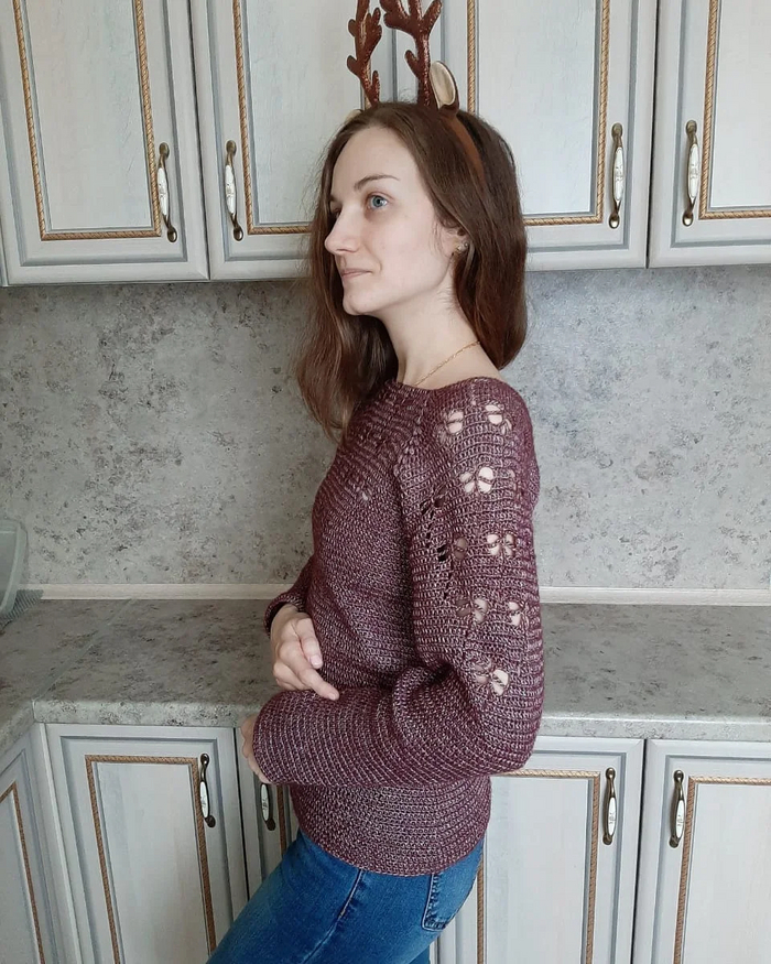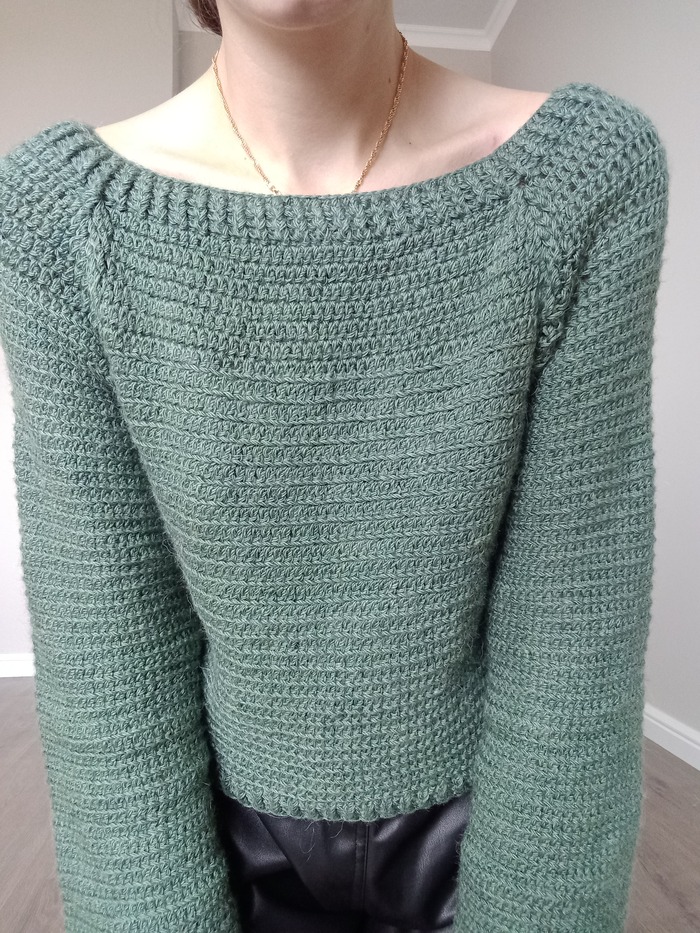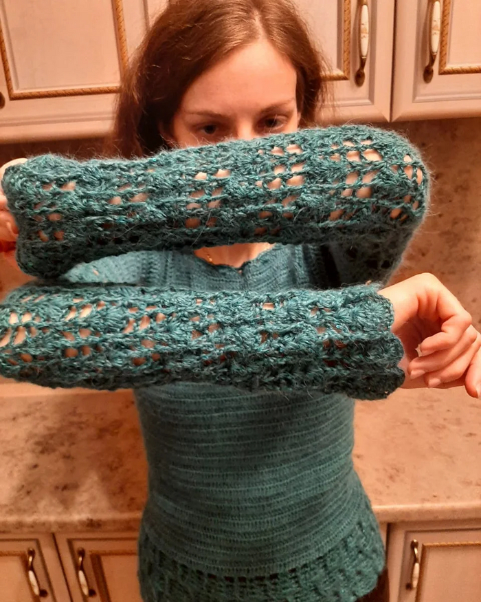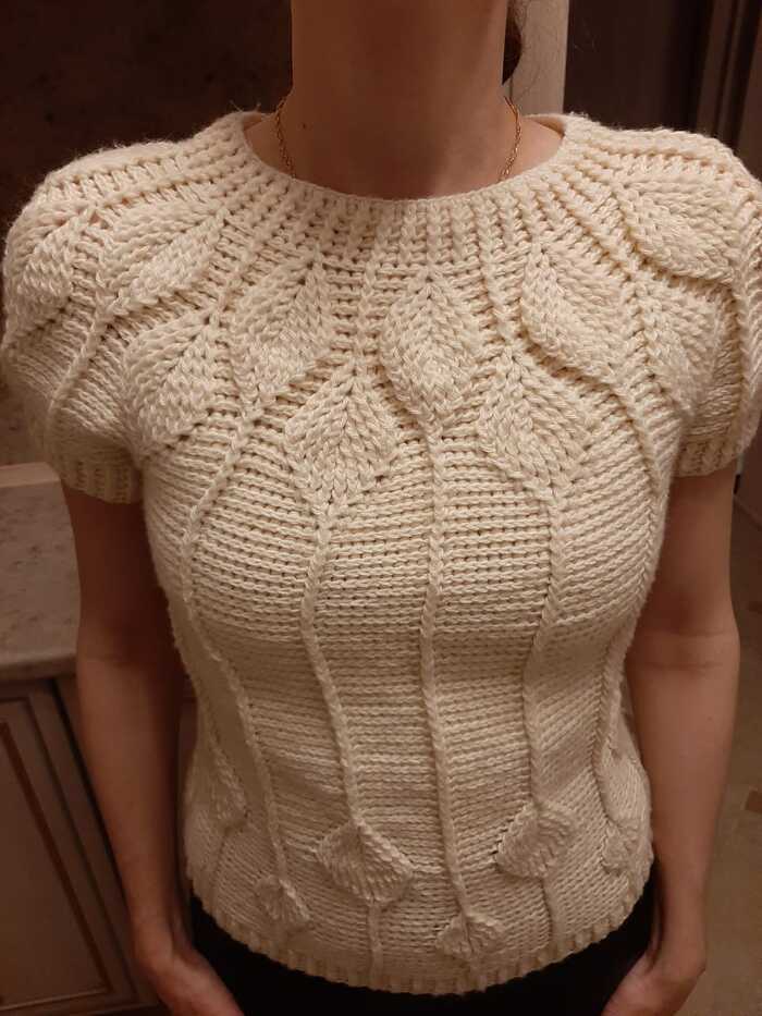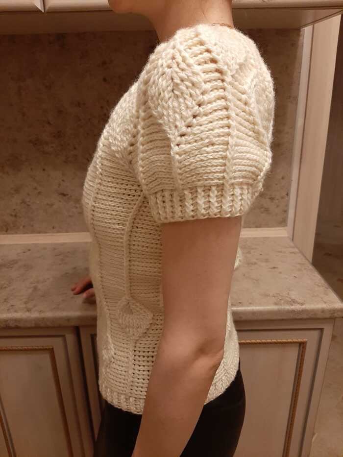 Конечно, его можно было связать ещё короче, так сказать, почти под грудь, но я за удобство, поэтому он не самый короткий из возможных. Но для меня и это большой прогресс, так как я воспринимаю только свитера до колен
