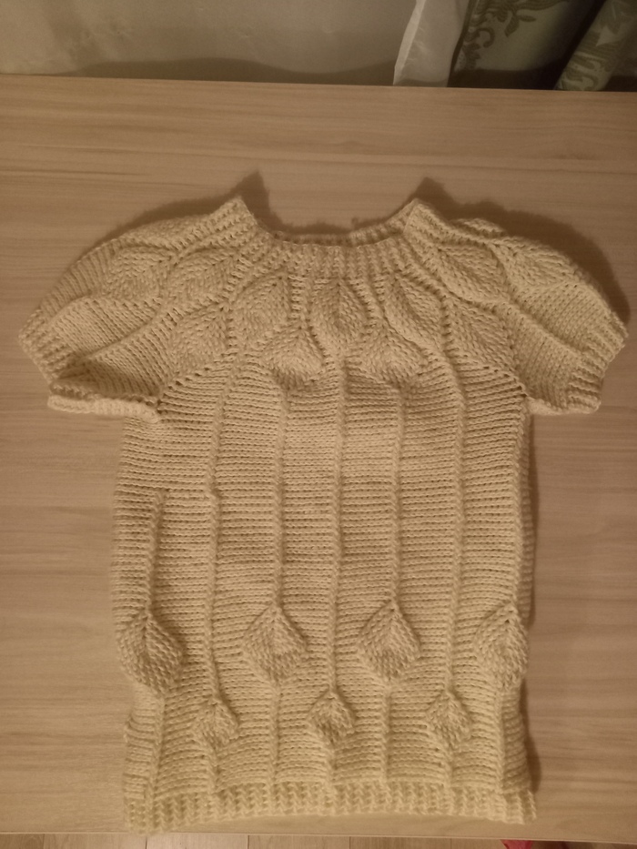 Почему она косячная? Во-первых, прерывание целых двух рядов из выпуклых лицевых столбиков с накидом слева на фото (где моя гипотетическая подмыха). Во-вторых, при вязании нижних листиков полотно нехреново так сузилось, и я еле впихнула свое пузо. Да, надо признать, что за год я набрала в области живота и... и кофта там натягивается. Я хотела перевязать, но какого-то хрена, пряжа распускается тяжело. Поэтому хрен с ней, буду втягивать живот.