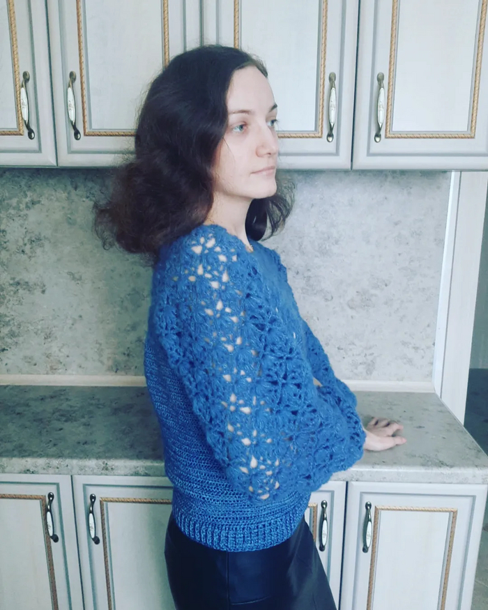 Эта кофта начата была ещё в январе 2022го года, по одному МК. Пряжу для неё я выбрала YarnArt Silky royal, в составе которой 35% искусственный шёлк и 65% меринос (50/140). Я взяла крючок номер 3,5 и 5 мотков этой пряжи, и почему-то решила, что мне хватит на целую кофту...