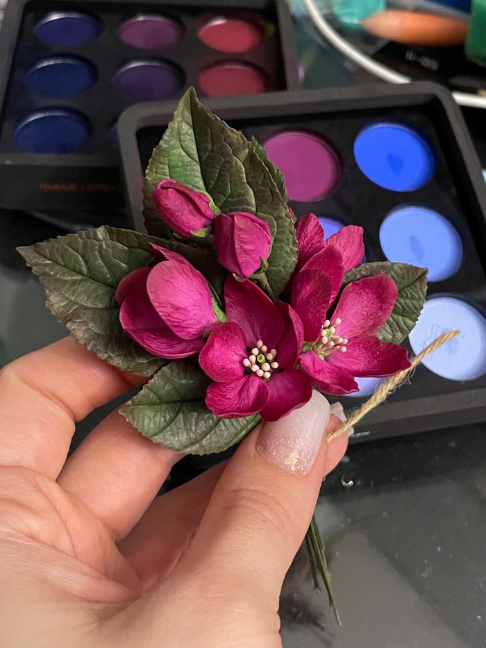 Процесс создания таких цветов занял некоторое время, но трудно сказать, какое точно. В целом, если считать только те дни, когда я занималась только цветками яблони, то выйдет не так уж и много. Но если считать перерывы между ними, то тут работа пары лет.