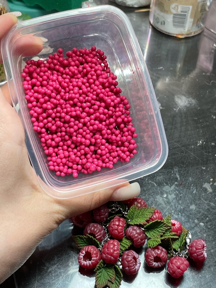 Все малинки выполнены из полимерной глины. Сухая пастель для тонировки. Нержавеющая сталь для того, чтобы собрать всех вместе и заключить в браслет (или не браслет)