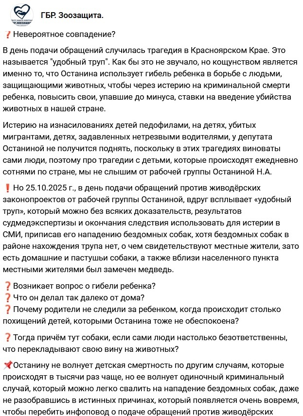 «Волонтеры подкармливают этих бездомных животных. Есть волонтер, которая сюда стабильно раз, два раза в неделю приезжает в это СНТ покормить эти стаи. Это место становится точкой притяжение для этих стай, и они эту территорию считают своей. И любая угроза, которую они замечают извне, в данном случае ребенок, у них провоцирует агрессию», — объяснила Чибрикова.