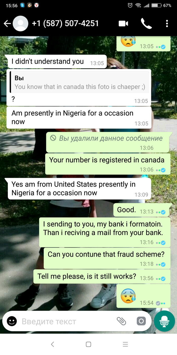 Продаю фотик на авито. Буквально через пару минут связывается со мной девушка (на аватарке была фото девушки с котами) со странным номером. Происходит это всё в Вацапе:.