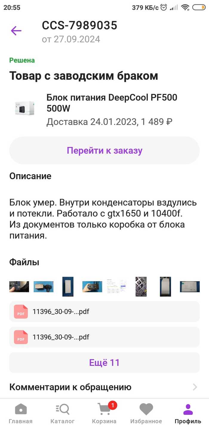 И тут внезапно, спустя два дня, после окончательного закрытия обращения, где я гордо иду на хутор.. продавец забирает бп с почты (я наивно думал, что мне оно вернется и я попробую отнести его в сервис, и вернуть хоть что то из затрат. Как выяснится чуть позже, такой же бп, с такой же проблемой, но от другого продавца и уже уехавший в сервис продавца, в это время едет ко мне обратно без ремонта с формулировкой "нерентабельный ремонт".. Та заявка еще открыта, меня там тоже немного игнорят, но пока еще ожидаю ответа..).