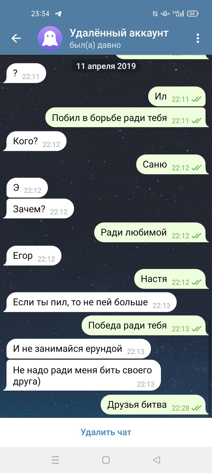Потом я ещё в августе 2019-го со злобы по пьяне тоже на ДР, на своём, писал этому парню, он мне наговрили гадостей и я хотел его отпиздить. Твёрдо решил, что когда-нибудь ударю его за эту беседу, и даже как-то вяло сталкерил его соцсети.