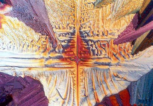 Лет почти двадцать назад, страдая фигней, заинтересовался съемкой через микроскоп. Был взят обычный ШМ-1, к нему посредством самодельного переходника присобачен Алмаз-103 со снятой пентапризмой. Объектами съемок служили кристаллы различных веществ, чаще всего фотохимии. Капелька раствора наносилась на предметное стекло, высушивалась, рассматривалась в проходящем поляризованном свете (кусок поляроида под предметное стекло, другой – на объектив микроскопа так, чтобы вращать можно было). Иногда получались весьма прихотливые картинки, часть из них предлагаю всеобщему вниманию.