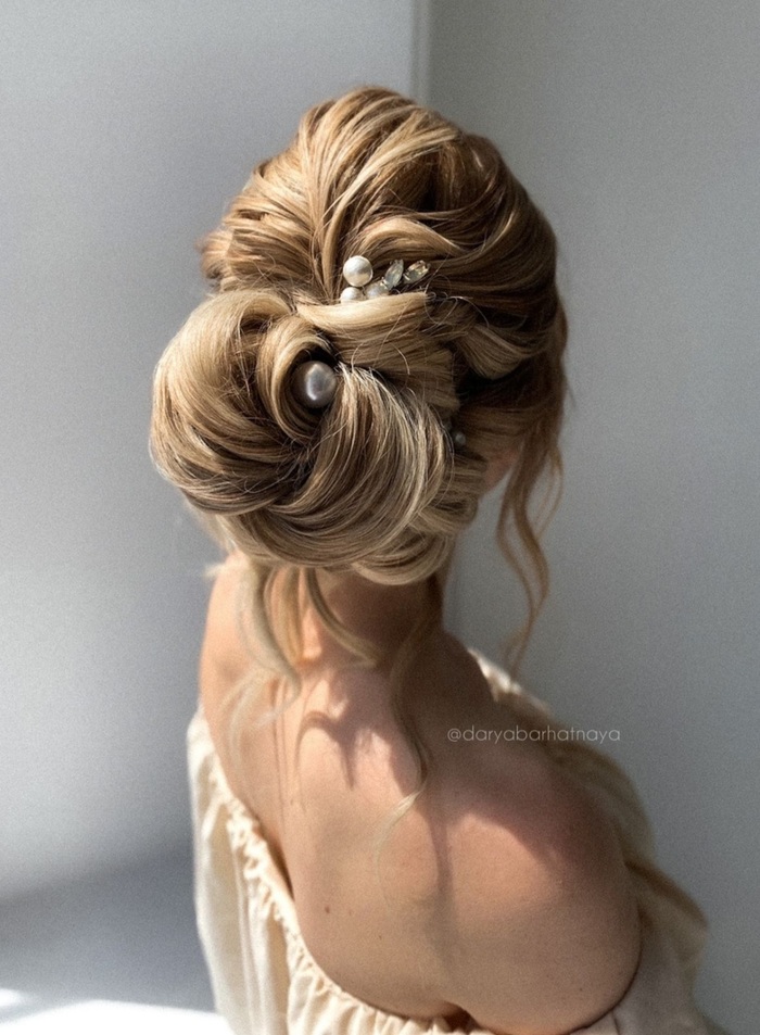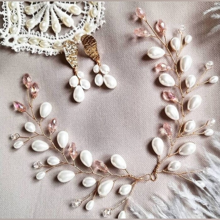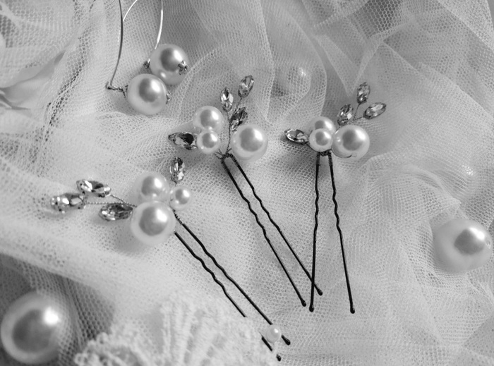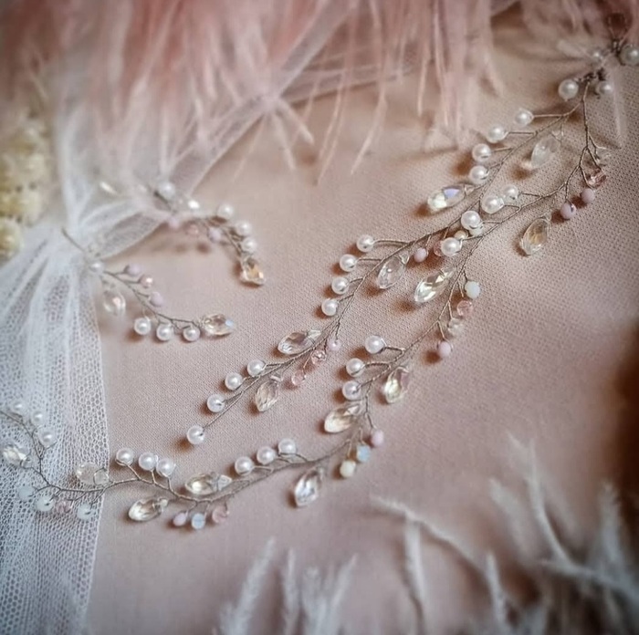 Прическа от стилиста, с которой мы работаем не первый год. Она со мной на одной волне, т е чувствует и видит, как надо расположить украшение, какое подойдёт к той или иной причёске (я просто готова петь ей дифирамбы). По правде говоря, мало мастеров умеют так профессионально управляться с этими веточками, листиками... правильно уложить, повернуть бусинку, поправить проволочку. А мне иногда даже обидно видеть свои украшения, которые как приехали в посылке, тряслись там где-то в дороге, согнулись, так их и не расправили....