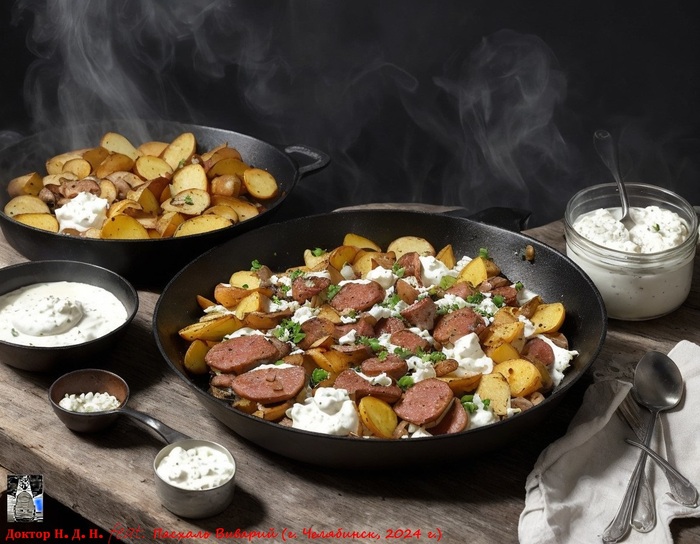 Накрыв поляну, хозяин дома показал свое гостеприимство. Он не скупился щедростью своих закромов. На стол он вывалил творог, молоко в крынке, сметану, поставил на стол огромную сковороду с шипящими шкварками из парного мяса молодого поросенка, поставил тарелку жаренной картошки с грибами, выложил два вида сала одно с чесноком, другое в аджике.