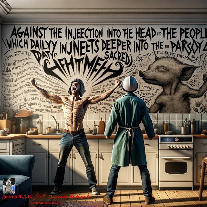 Даже на кухонной стене каллиграфическим почерком четко разборчивыми буквами написал лозунги – «Против укола в голову народа, который ежедневно инъецирует партия поможет священный шлем» и «Укол глубже проникает в мозг чем массаж».