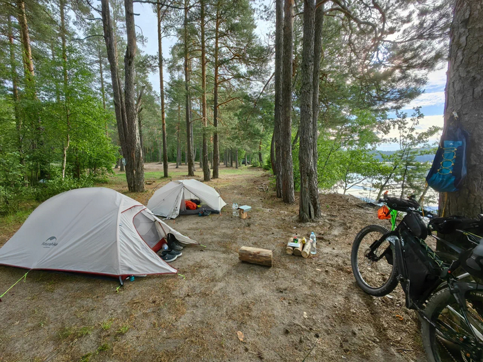 На тридцатом километре решил срезать путь по грунтовке. Сначала всё выглядело хорошо, но вскоре дорога стала теряться в густой траве и позже упёрлась в завал из молодых берёз. Шёл пешком, отмахиваясь от настырных лосиных мух, а на обратном пути снял с себя клеща. Вернулся к маршруту и почувствовал, как приятно снова крутить педали.
