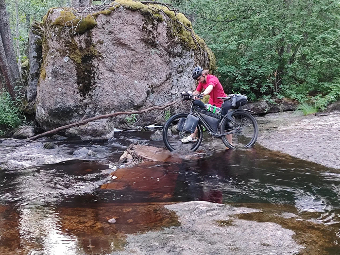 На пятидесятом километре настало время перерыва на обед. На выходе разговорился с мужчиной, подъехавшем на квадроцикле. Он поинтересовался, откуда я еду, куда хочу доехать. Сказал, что брод по колено и что я могу промочить обувь. Брод действительно оказался не глубоким. Прозрачная прохладная вода журчала по перекату, под ногами мелькали рыбки. Перешёл в специально для этого взятых сандалях. За бродом началась грунтовка, ехать по ней было приятно и легко.