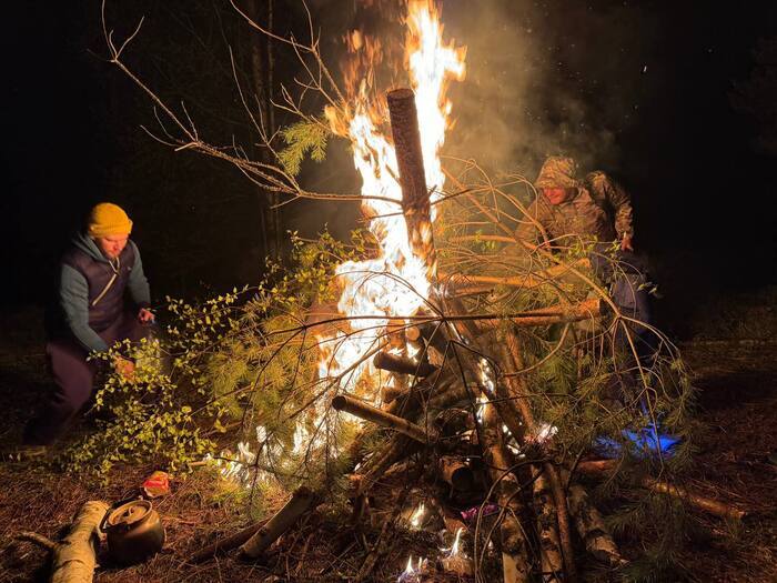 В первую ночь развели костер типа “Шалаш”, потому что он был похож на горящий дом. Чтобы построить этот дом, процесс добывания древесины не прерывался до утра