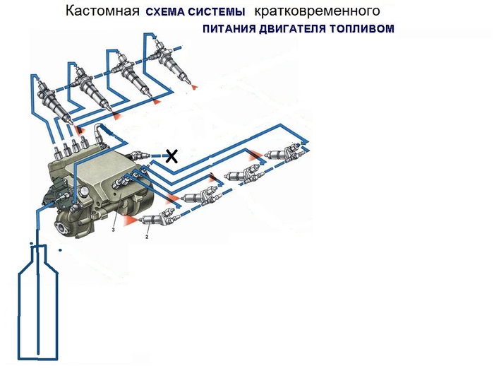 С утра начали собирать в кучу всё экспроприированное. Поставили форсы, тнвд, трубки высокого давления. Дальше следите за руками. На выход обратки из тнвд прикручиваем кусок заклепанной трубки с помошью штуцера. т.е. делаем заглушку. Соединяем выход из подкачивающей помпы со входом тнвд, на вход подкачивающей помпы прикручиваем шланг, который опускаем в полторашку с соляркой. Отпускаем заглушку обратки на пол оборота и прокачиваем помпой сильно кастрированную систему, пошла солярка без воздуха, закручиваем заглушку. Ниже топливная система здорового человека.