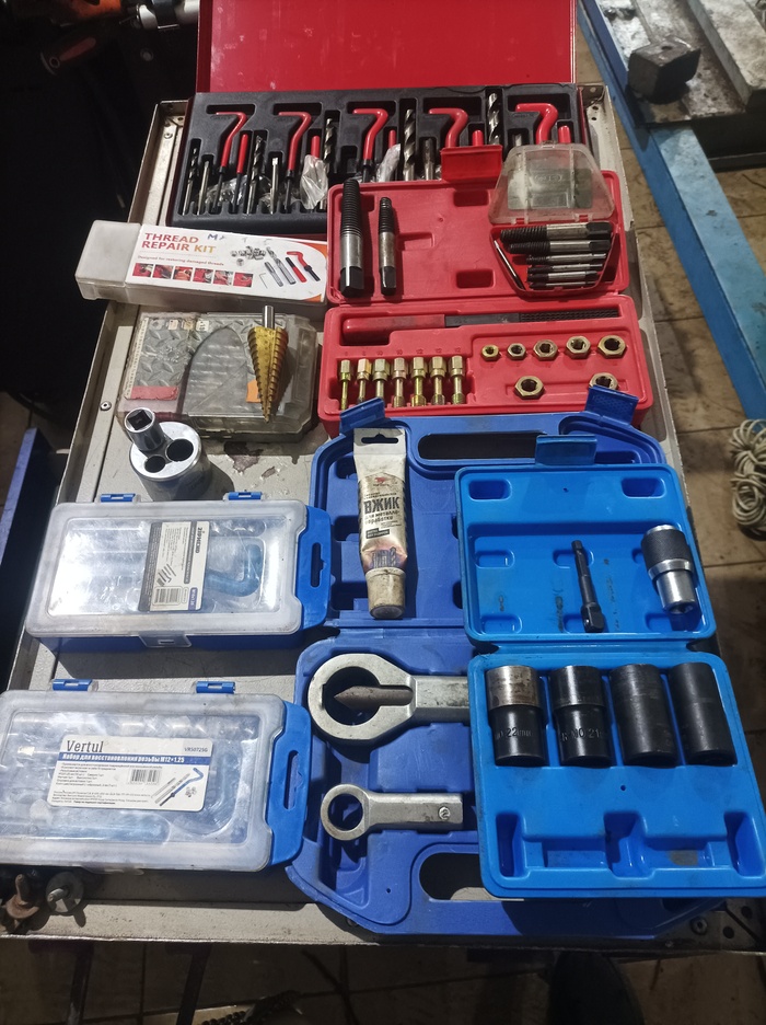 Из набора по восстановлению резьбы (красный кейс) полезен только напильник, остальное - это жалкое подобие метчиков и плашек из пластилина. Предполагалось, что они в виду необычной геометрии резцов будут не резать, а сминать резьбу. На деле же надежд не оправдали