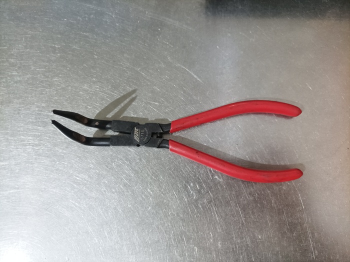 6. Съемник стопорных колец с удлиненными наконечниками. Такая штука будет незаменима при замене внутренностей тормозного поршня. Обычными съемниками туда не подлезть. Даже этот пришлось доводить до ума напильником.
