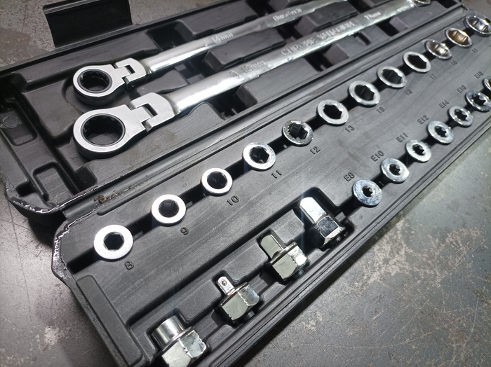Такие трещетки не раз выручали во время замены приводного ремня или регулировки развала. Свою цену оправдать ещё не успели, да и металл насадок тонковат, но внимания вцелом заслуживает.