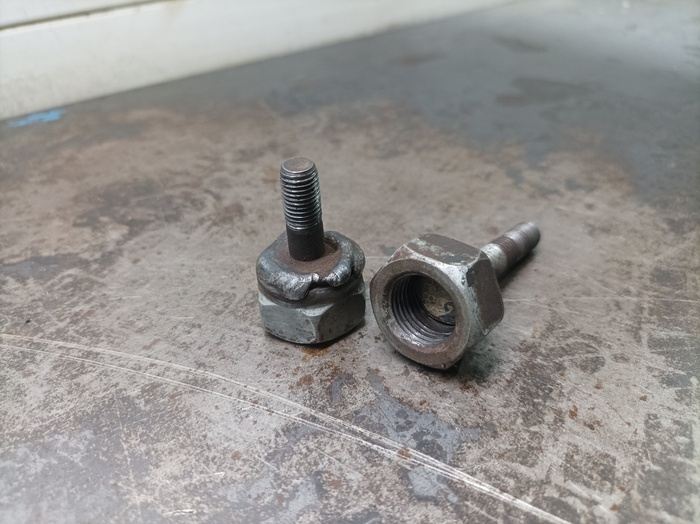 Сваренные болты с шагом 1 и 1,25 с гайкой. Все просто и со вкусом. Болтовая часть вкручивается в направляющую, а с обратной стороны вкручивается обратный молоток. После прогрева скобы горелкой, вытащит вообще любую гниль. Пока не подводила. Прекрасная альтернатива сверлу или болгарке (не одобряю такие способы)