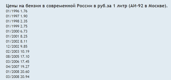 Погуглив сколько стоили цены на бенз в 2000-2001г (посколько в то время авто я не водил) я нашёл инфу: