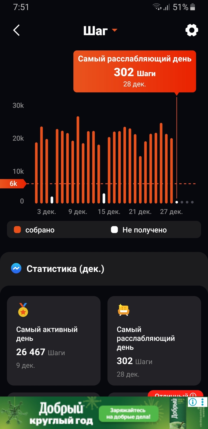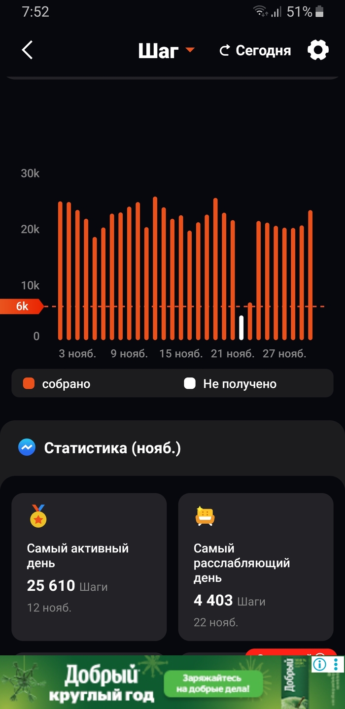Фото до-после нету,вот статистика возможно кривого приложения ноябрь-декабрь ,смарт часов нету,так,для наглядного примера .Чётко видно когда у меня выходной и как их мало)