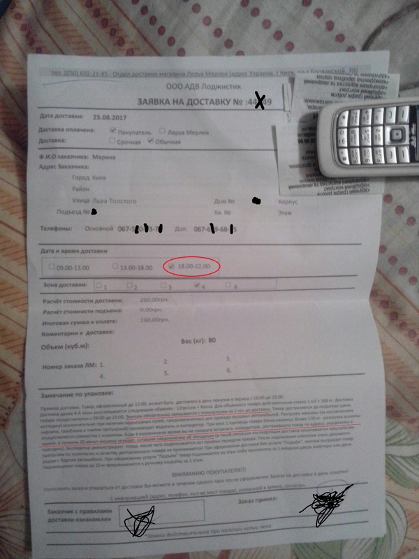 По давним просьбам моей мамы-пенсионерки решила заняться ремонтом балкона квартиры в центре Киева. После долгих уговоров этим также стал заниматься мой молодой человек. Вместе выбрав все необходимые материалы выбор остановился на магазине Леруа Мерлен, так как он был относительно близким к обоим нашим домам. Купив всё необходимое, было решено оформить доставку, так как машины пока своей не имеем, а тащить более 60кг стройматериалов через весь Киев не очень хотелось. Первой моей ошибкой была дата покупки - 23 августа. Как известно всем, 24 августа - День Независимости Украины, в общем - общий праздник. Из-за этого мне предложили доставку аж на 25 августа. Хоть мы и хотели 24 августа вместе заняться балконом, но делать нечего - назначили доставку на 25 число в период с 18:00 до 22:00. Дала телефоны свой и мамы, которая всегда дома. И ничего не предвещало беды.