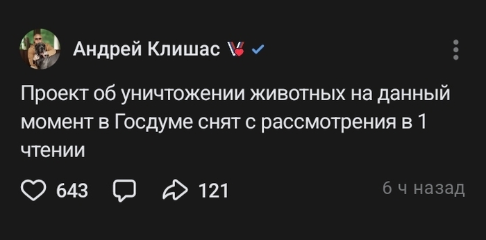 Обращаюсь к двум фракциям – «Новые люди» и «Справедливая Россия». Вы не высказали своё отношение к законопроекту. Я обращаюсь к вам с просьбой и предложением – создайте межфакционную группу, езжайте в регионы, стройте приюты, объединяйте зоозащитников, вкладывайте свою заработную плату, хоть что-нибудь делайте наконец...