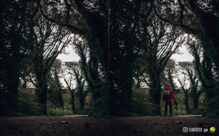 Когда вы начинаете построение кадра, вы должны решить для себя, о чем этот кадр. Что является главным объектом. Многие совершают ошибку, когда просто снимают красивые горы или лес на заднем плане, но ничего нет перед ним. Это как создать красивые декорации и забыть позвать актеров на спектакль. Ваша пьеса будет скучна, а зрители в недоумении. Причем зачастую лес или гора могут быть самодостаточным главным героем кадра, но снимающий не смог правильно расставить акценты и на снимке все объекты равноценны. Всегда, когда снимаете, спросите себя, что вы снимаете, а потом ответьте себе на вопрос, был бы этот снимок интересен лично вам если бы вы случайно натолкнулись на него в интернете? Пролистали бы вы его как что-то банальное или глаз зацепился бы за что-то интересное? Не все снимки должны быть шедеврами, многие это просто часть серии, дополняют общую историю деталями. Например, вы поехали в путешествие и хотите запечатлеть делали которые со временем выветриться из воспоминаний. Всегда думайте, что именно и зачем снимаете. Задавайте себе вопрос, что именно происходит в кадре. Если вы просто нашли красивую пещеру или водопад, подумайте как можно лучше указать на то, что этот объект первостепенный в кадре. Для примера я взял кадр из серии про мою поездку по Шотландии. На первом снимке мы видим вход в парк, есть мягкий свет, есть рамка из деревьев, открытая диафрагма дает ощущение объёма, но непонятно куда смотреть. У меня взгляд падает на центральное дерево и сразу появляется вопрос, что фотограф хотел в этом дереве показать такого необычного, что даже достал из сумки камеру. Далее мы вводим в кадр основной объект, который помимо всего еще имеет цветовой контраст, и сцена оживает. Мы видим, что это фотограф, он что-то разглядывает, появляется сюжет. Конечно, из этого работает не всегда, например в паттернах или другой съемке может быть по-другому, но в большинстве жанров фотографий это очень важный момент.