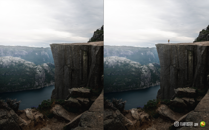 Или, к примеру мой кадр с Прекестулен, где по человеку можно понять как расстояние, так и размер скалы.