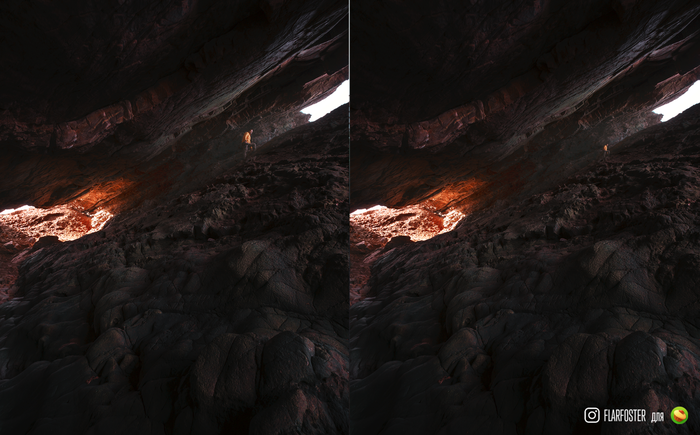 Для иллюстрации этого момента я использую фотографию пикабушника @shuffleboy, который заснял меня в шотландской пещере. Во-первых давайте в целом пройдемся по кадру. Что мы видим, у нас есть отличный передний план, есть я на среднем и световые пятна как фон. Также он расположил меня на пересечении третей. Кадр сделан в тени, поэтому на камнях мы видим приятный объем. Есть главный объект в кадре, который контрастирует по цвету с окружающей средой. Есть вектор внимания, создающийся между двумя световыми отверстиями, подчеркнутый сводом потолка и пола пещеры. Камни также дают направление вовнутрь снимка. В кадре присутствуют все моменты, о которых мы говорили, но также тут есть ощущение масштаба. Допустим мы уменьшим меня на кадре, сразу меняется ощущение масштаба в этой пещере. Все дело в том что часто многие объекты на кадрах могут быть как одного так и другого размера, многие водопады могут казаться ручейками, если вы не расположите рядом с ними объект, размеры которого нам известны.