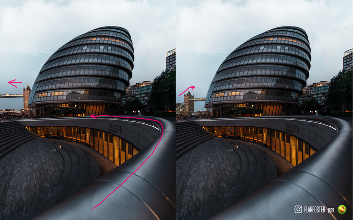 Второй пример — это здание мэрии в Лондоне. Мы видим конструкцию, которая, начиная снизу ведет нас по изгибу в центр кадра. На первом кадре есть косяк в виде моста слева. Из-за того, что вторая башня моста не влезла в кадр, наше внимание по верхнему пилону моста уходит за левый край фотографии. Немного магии фотошопа, и направление меняется. Причем переделал я этот кадр во время написания поста, так что мои фотки тоже далеко не идеальны.