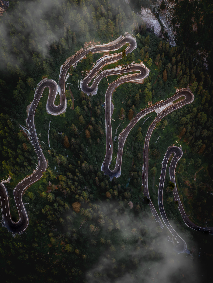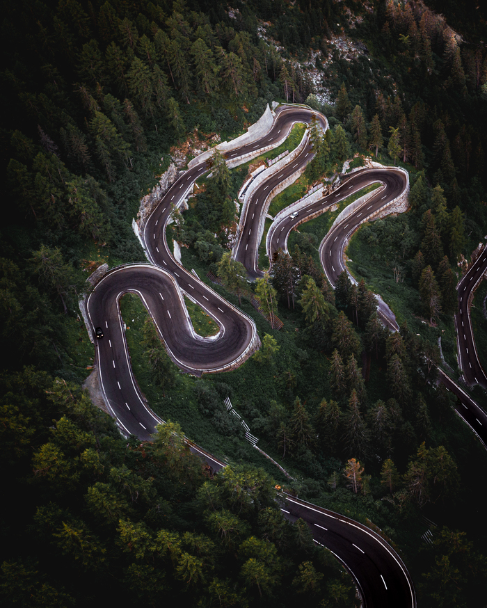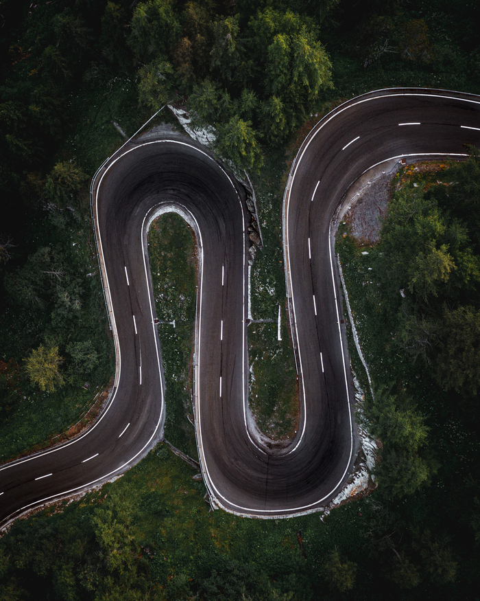 Горная дорога Maloja Pass в 5 утра. Высота самой дороги около 1800 метров, высота съемки 2200 метров.