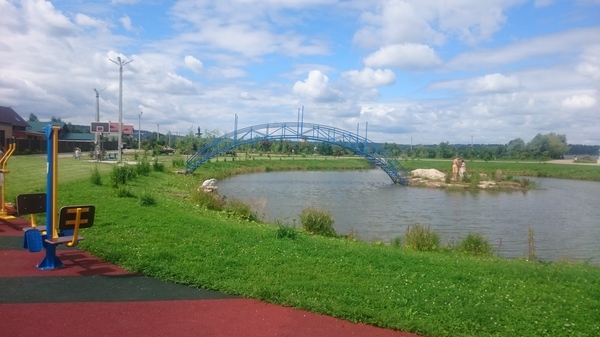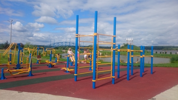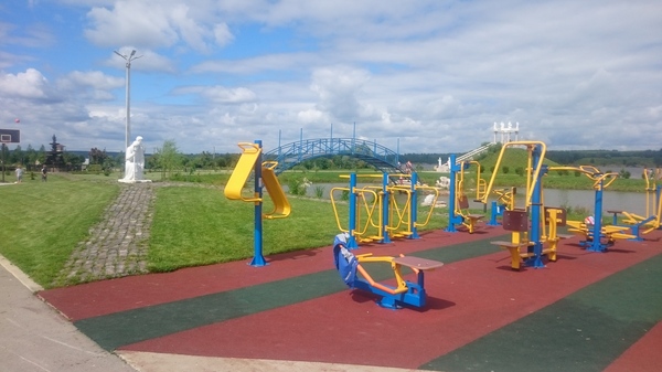 Этой весной была оборудована площадка с уличными тренажерами, бетон покрыт прорезиненным безопасным покрытием.