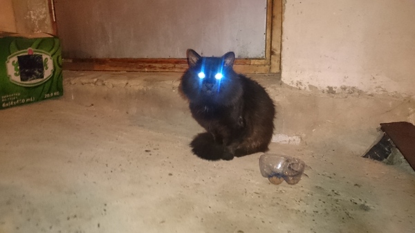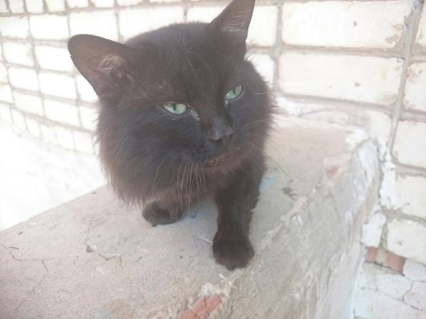 Кот это или кошка не установлено, по внешности и поведению похож на кота. В меру пушистый, некрупный, полностью черный, глаза зеленые. Еще совсем молодой.