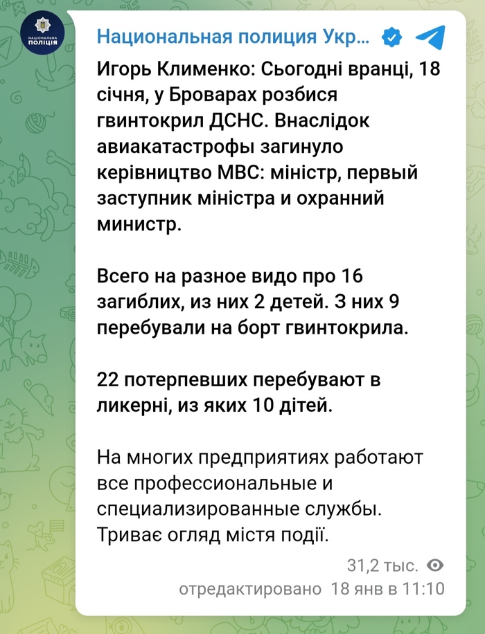 Всего, по словам главы Нацполиции Украины Игоря Клименко, известно о 16 погибших в результате падения вертолета, среди них двое детей. Отмечается, что 9 человек из числа жертв инцидента находились на борту вертолета.