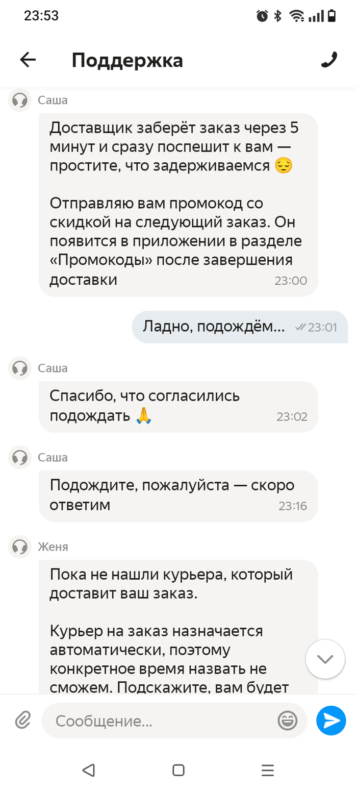 Яндекс, вот вы нафига так делаете? Вы сами поставили срок доставки в течение часа - а по факту оказалось, что и вовсе не можете выполнить заказ. Ну не можете вы за час собрать заказ в аптеке и доставить - ну и не берите заказы после 21:00. А вы аж дважды обещали, что курьер "в течение 5 минут" (!!) заберёт мой заказ.