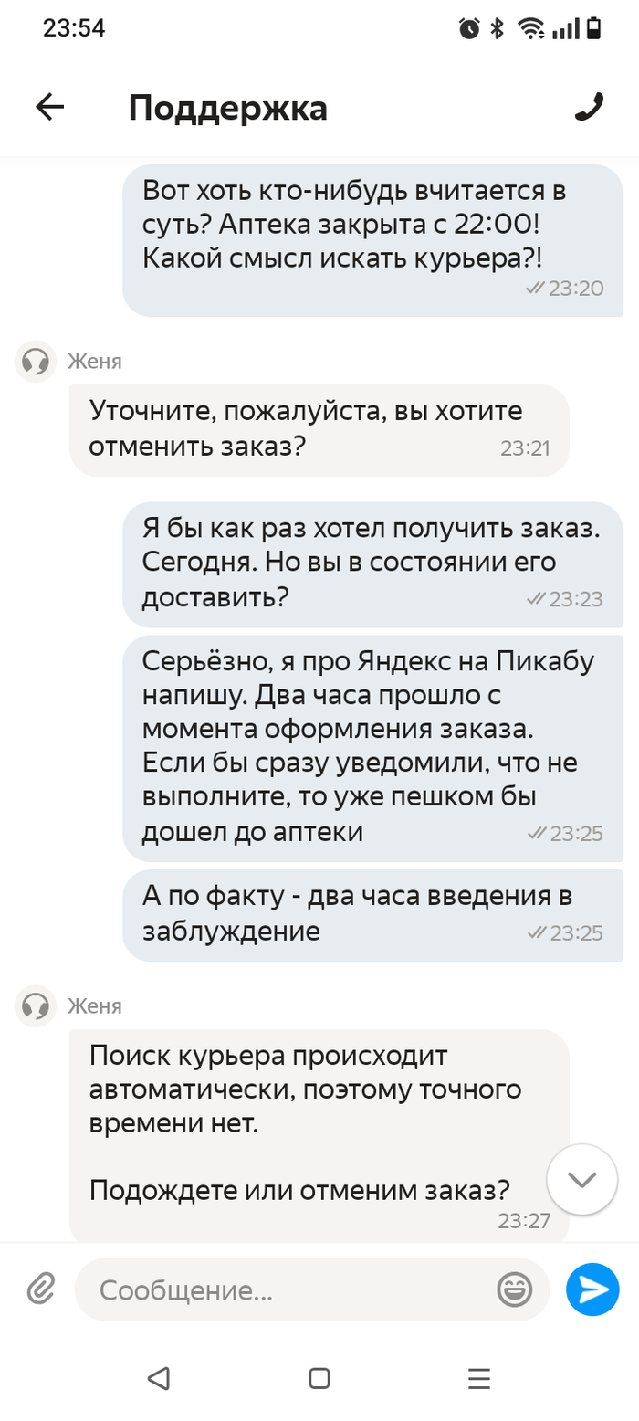 То есть мне дважды (!) обещали, что курьер заберёт мой заказ "через 5 минут", плотностью игнорируя мои слова, что аптека уже тупо закрыта.