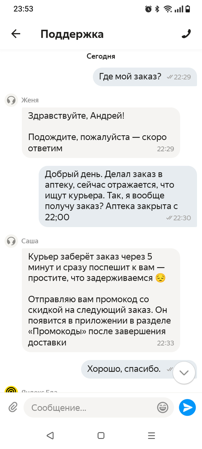 В 22:30 меня начали терзать сомнения. Аптека работает до 22:00. А мне вновь ищут курьера. А куда, он, курьер приедет для того, чтобы забрать заказ? К дверям закрытой аптеки?